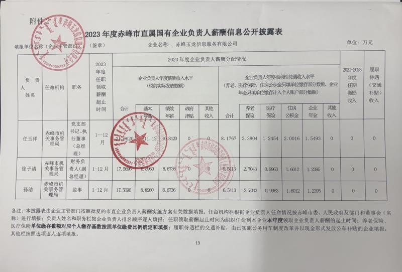 2023年度赤峰市直屬國有企業(yè)負責人薪酬(赤峰玉龍信息服務有限公司)