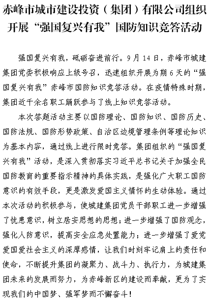 赤峰市城市建設(shè)投資(集團(tuán))有限公司組織開展“強(qiáng)國復(fù)興有我”國防知識(shí)競答活動(dòng)