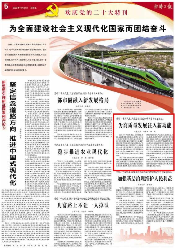 黨的二十大報(bào)告提出,必須完整、準(zhǔn)確、全面貫徹新發(fā)展理念,堅(jiān)持社會(huì)主義市場(chǎng)經(jīng)濟(jì)改革方向,堅(jiān)持高水平對(duì)外開放,加快構(gòu)建以國內(nèi)大循環(huán)為主體、國內(nèi)國際雙循環(huán)相互促進(jìn)的新發(fā)展格局。“我們將緊緊圍繞推進(jìn)中國式現(xiàn)代化、全面建設(shè)社會(huì)主義現(xiàn)代化國家這個(gè)奮斗目標(biāo),推動(dòng)經(jīng)濟(jì)高質(zhì)量發(fā)展,奮力書寫全面建設(shè)社會(huì)主義現(xiàn)代化赤峰新篇章?!秉h的二十大代表、內(nèi)蒙古自治區(qū)赤峰市委書記萬超岐表示。