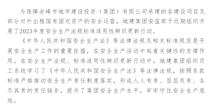 赤峰市城市建設(shè)投資(集團)有限公司開展安全生產(chǎn)法規(guī)標(biāo)準(zhǔn)適用性辨識更新工作